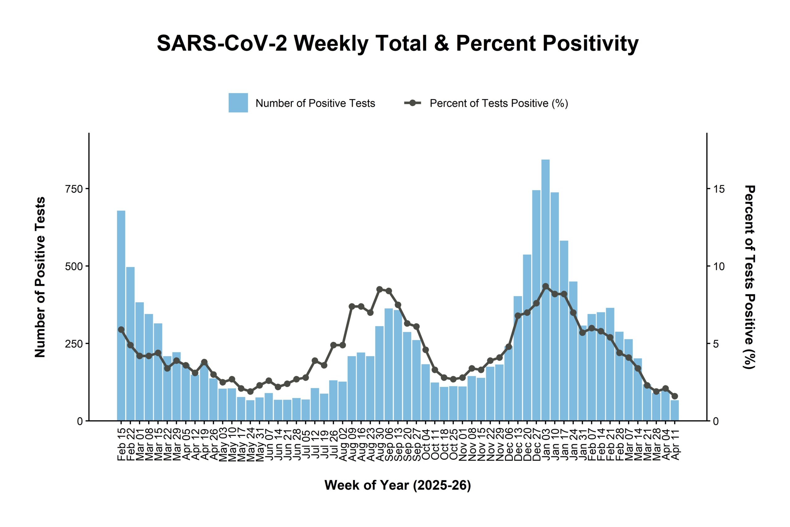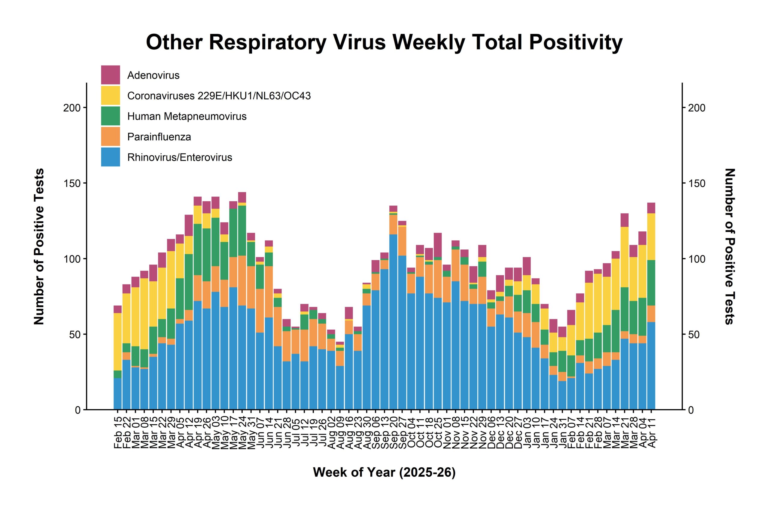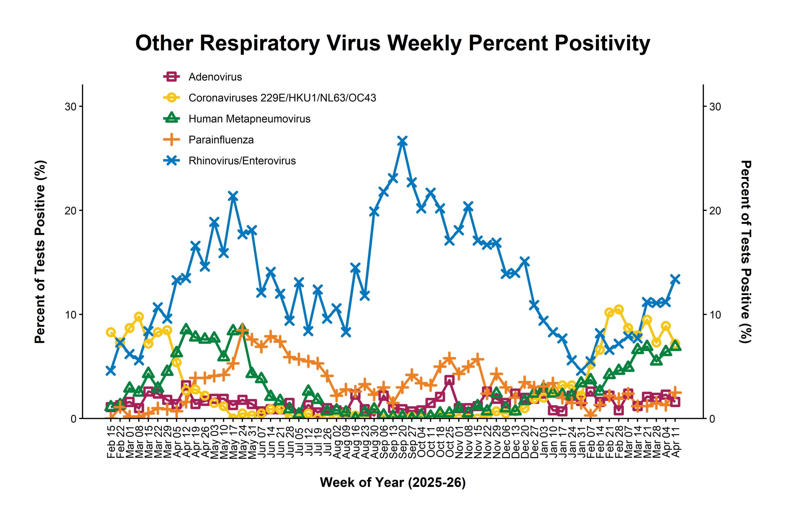 The Respiratory Pathogen Positivity Rate Report tracks the presence of influenza, SARS-CoV-2 (COVID-19), respiratory syncytial virus (RSV), and other respiratory pathogens, including adenovirus, seasonal coronaviruses, human metapneumovirus, parainfluenza, rhinovirus/enterovirus, Bordetella pertussis, and Mycoplasma pneumoniae in the Northeast Ohio community.